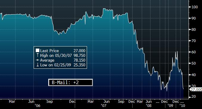 According to Trace (the graph above is based on Trace versus my message runs) there was a million + dollar worth of bonds traded on the 22nd of November. Alex Bea, a fantastic distressed debt trader from JPM who was the axe in this name, stoppped making markets sometime in October – thinking they got restricted and all that was left was sporadic runs from a number of brokers / dealers.